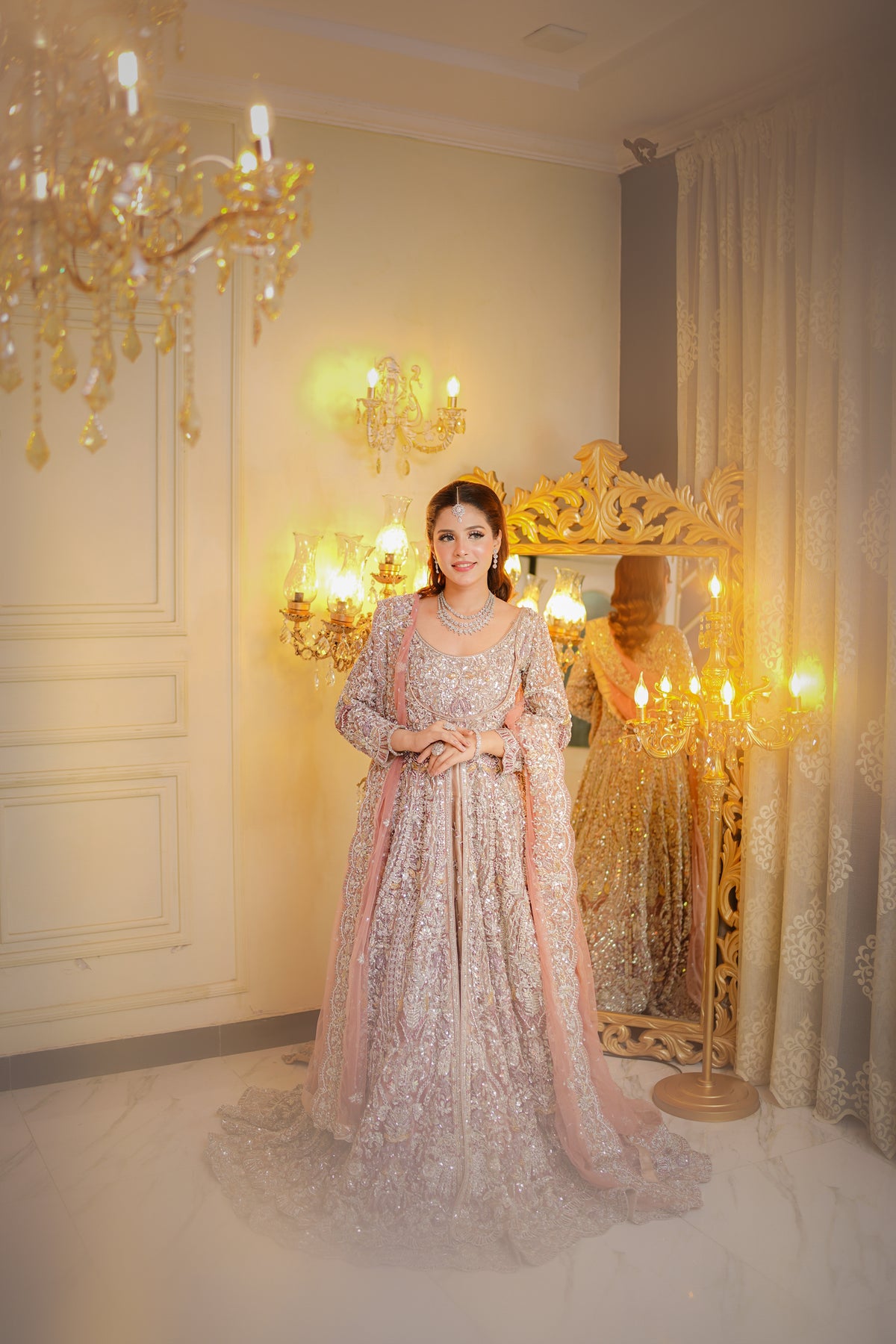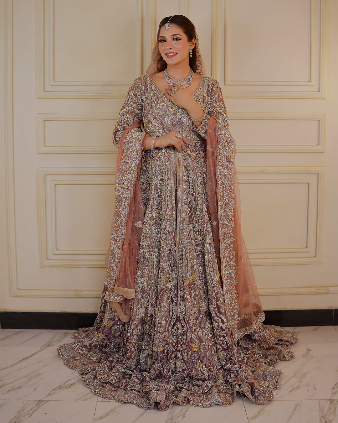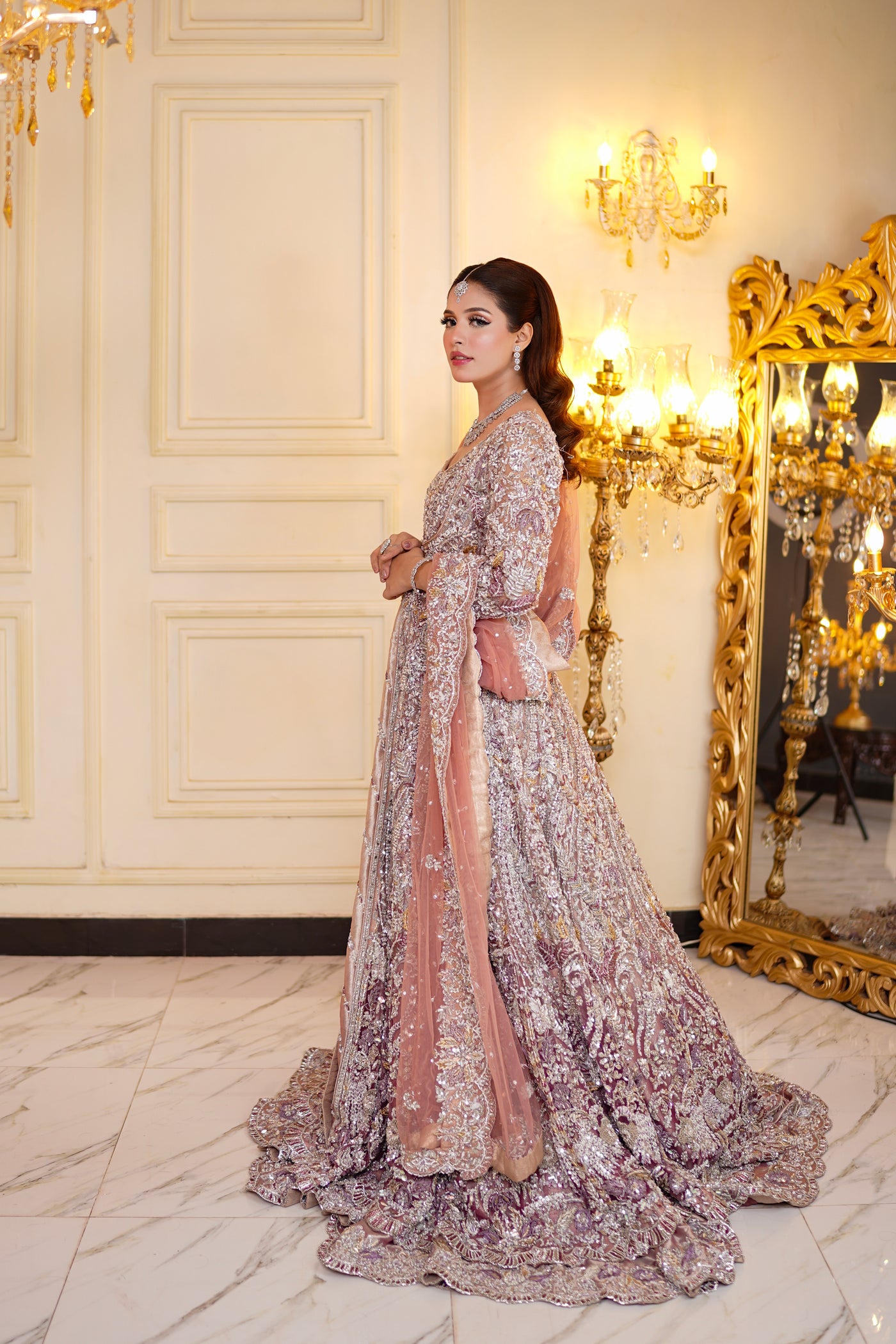 The Majestic Charm dress from Roshanara Bridal Collection is a stunning example of bridal elegance. The rich embroidery and intricate details are complemented by luxurious fabrics, offering a royal touch to your wedding attire. The bold design, combined with graceful embellishments, is perfect for making a statement while maintaining timeless beauty. Whether it’s a traditional or contemporary wedding, this dress ensures that you stand out with elegance and charm. Feel majestic and beautiful as you celebrate the most important day of your life.